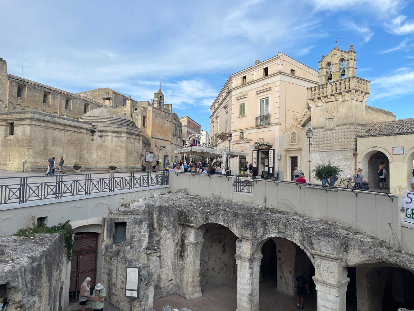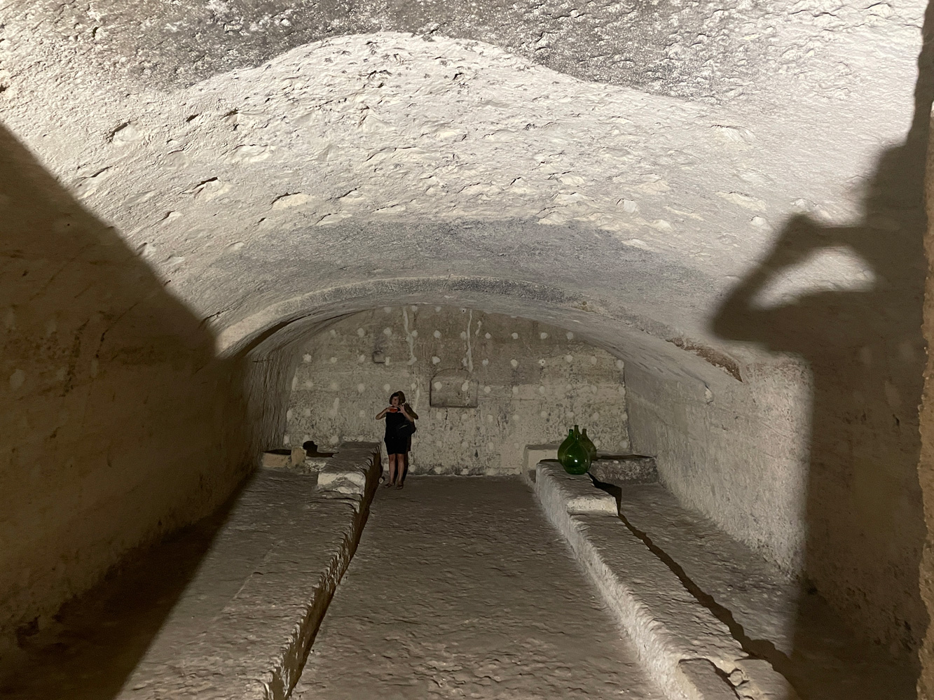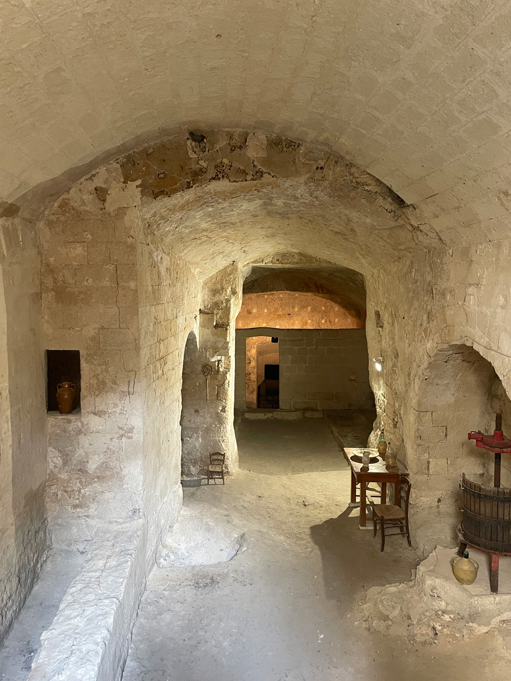 Matera dagegen ist unsers! An einer Schlucht gelegen und gebaut, gilt es als einer der ältesten Siedlungen der Welt. Schon die Urbewohner lebten in Höhlenwohnungen in den Felsen, den Sassi, und diese waren bis 1952 bewohnt, bevor sie aus hygienischen Gründen geräumt wurden. Kaum vorstellbar. Eine von den Höhlenwohnungen sehen wir uns an. Sie ist in der Stadt und mit einem „normalen“ Wohnhaus überbaut. Das muss merkwürdig sein, ohne Fenster. Wasser wurde in Brunnen „gesammelt“, der Kamin hatte immerhin einen Abzug. Und einen Weinkeller gab’s! Aber vielleicht war`s ja irre gemütlich? Matera ist auf jeden Fall eine Empfehlung – auch ohne Küste …
