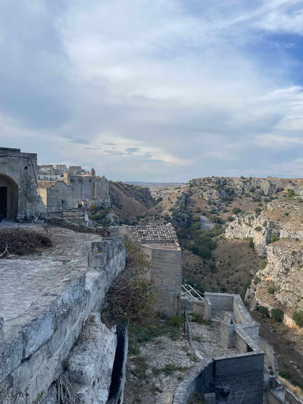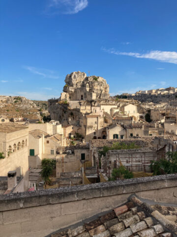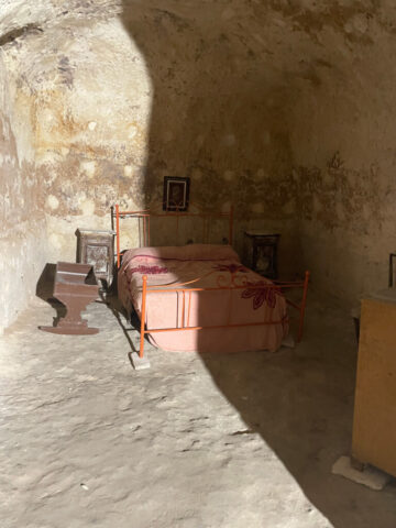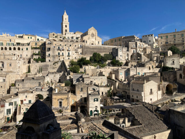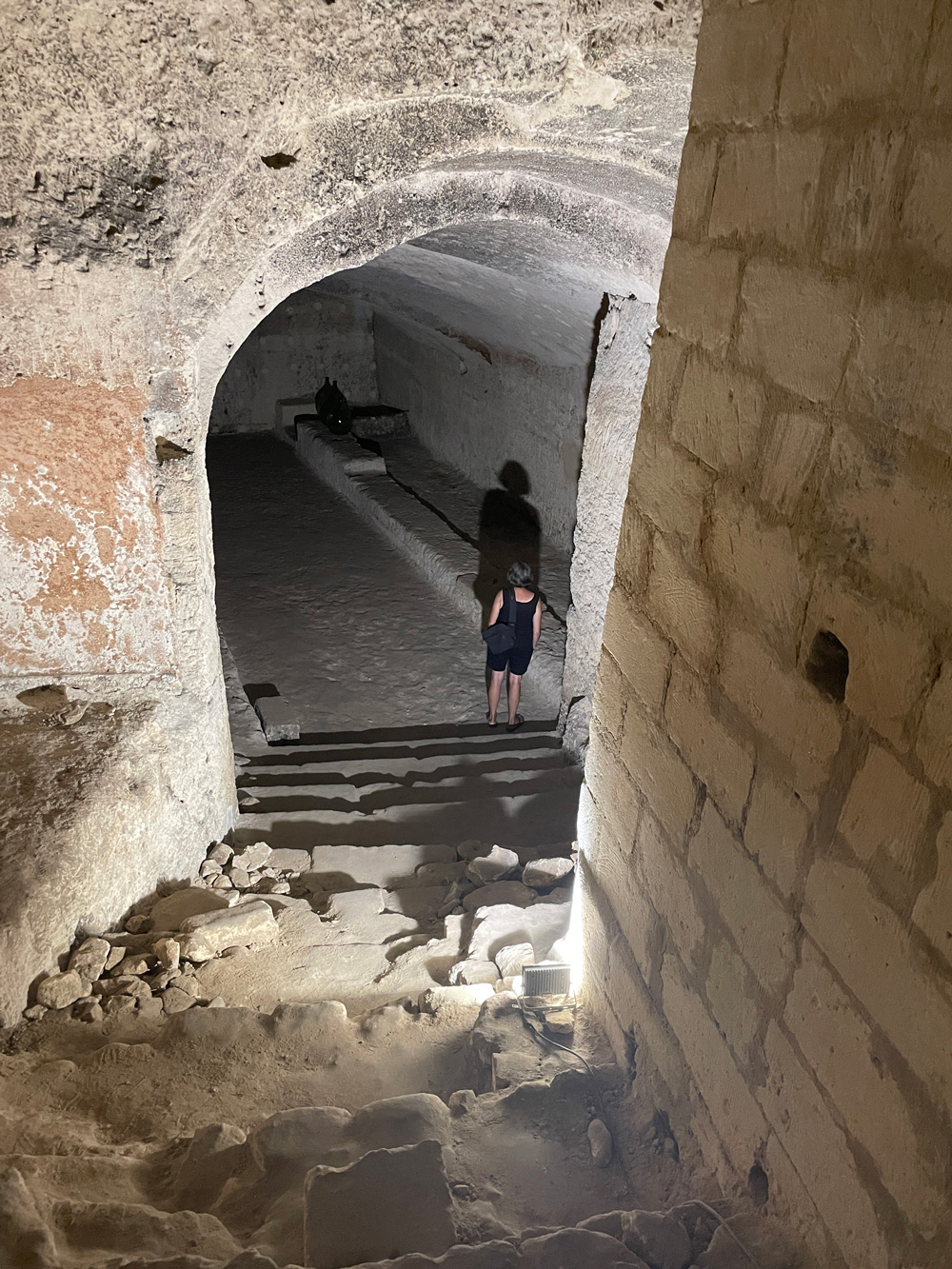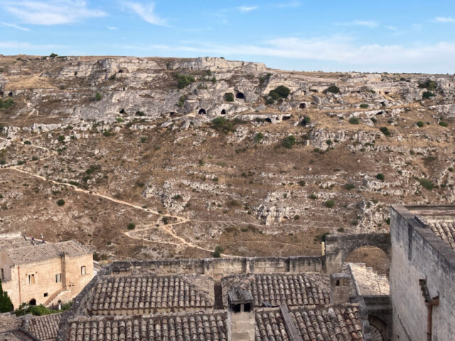 Matera dagegen ist unsers! An einer Schlucht gelegen und gebaut, gilt es als einer der ältesten Siedlungen der Welt. Schon die Urbewohner lebten in Höhlenwohnungen in den Felsen, den Sassi, und diese waren bis 1952 bewohnt, bevor sie aus hygienischen Gründen geräumt wurden. Kaum vorstellbar. Eine von den Höhlenwohnungen sehen wir uns an. Sie ist in der Stadt und mit einem „normalen“ Wohnhaus überbaut. Das muss merkwürdig sein, ohne Fenster. Wasser wurde in Brunnen „gesammelt“, der Kamin hatte immerhin einen Abzug. Und einen Weinkeller gab’s! Aber vielleicht war`s ja irre gemütlich? Matera ist auf jeden Fall eine Empfehlung – auch ohne Küste …