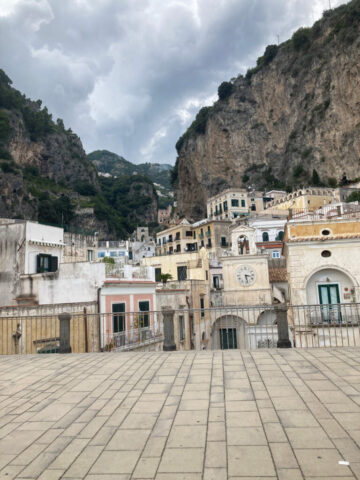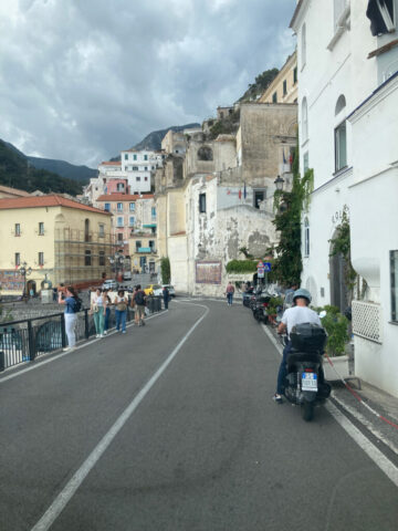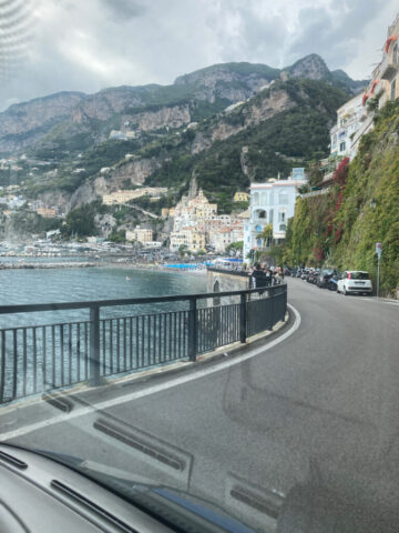 … und spektakulär zu fahren! Verrückt, voll, fantastisch, bellissima! Wir hatten vor, den „Götterweg“ von Agerola nach Positano zu laufen und dabei die Amalfiküste aus der Höhe kennenzulernen. Ging aber nicht. Während der ungefähr 4-stündigen Fahrt die Küste entlang gab es wirklich KEINE Möglichkeit anzuhalten, geschweige denn zu parken. Ach ne, gelogen. Einmal haben wir uns in eine Haltebucht in einer Kurve gequetscht um eine kurze Pause zu machen. Aber ansonsten: Auto an Auto, VIP-Chauffeure, Security, Überseetouristen (Mutmaßung). Ist kein Geheimtipp mehr, die Amalfiküste. Wir haben uns vorgestellt, wie das in den 60er-Jahren gewesen sein muss – sicher sehr schön und besonders! (lieber Gerd, wir haben an dich gedacht!) Schön ist es immer noch, aber leider leider zu voll.