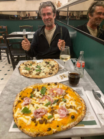 Weil wir nicht halten können, müssen wir bis Pompeji fahren und werden mit einer Pizza (eher einem Pizzalappen – hängt mächtig über den Tellerrand) bei Michele belohnt. Einer DER neapolitanischen Pizzabäcker – und das in Pompeji!