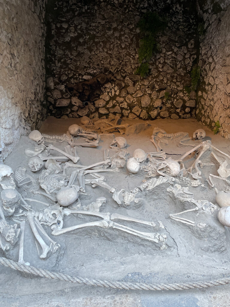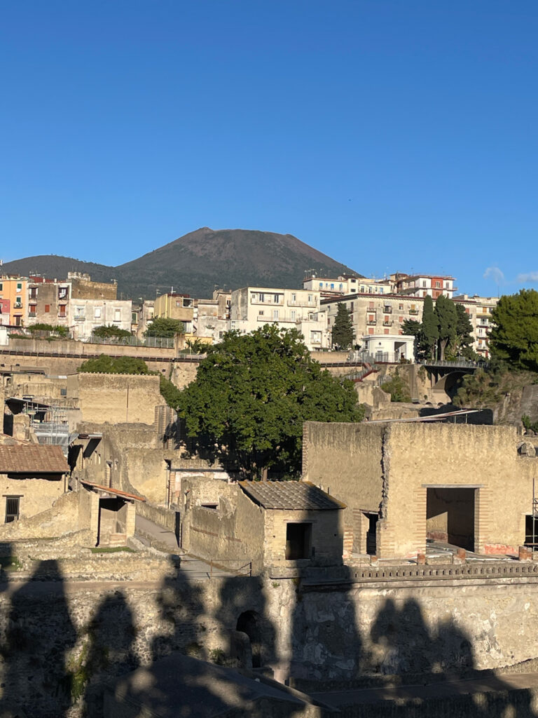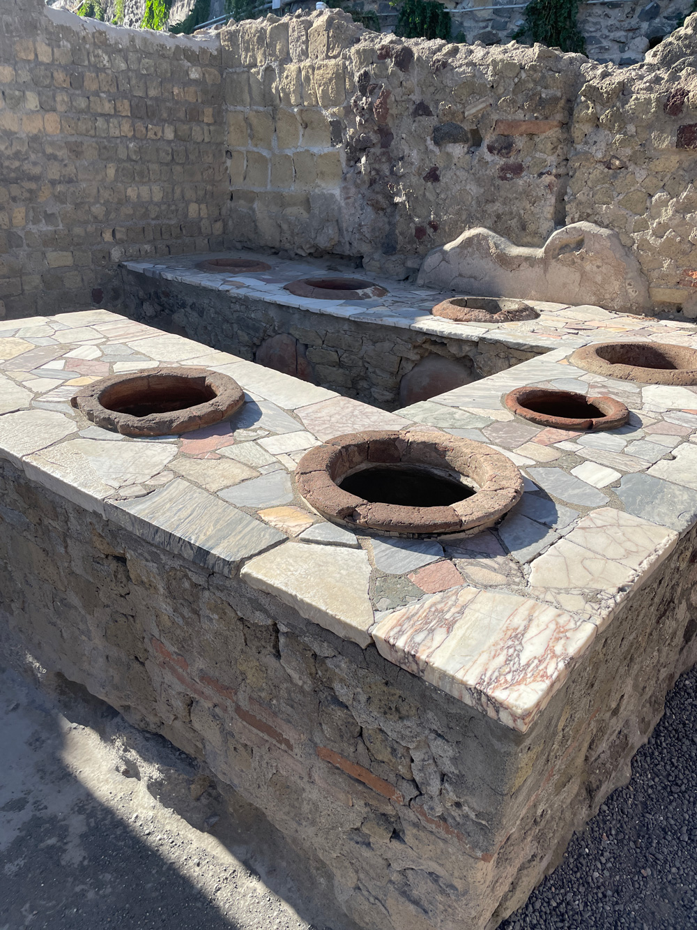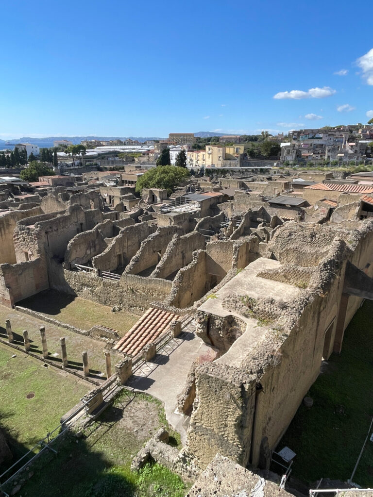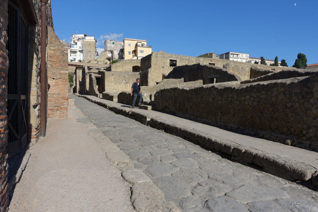 Herculaneum wurde zusammen mit Pompeji Opfer des Vesuvausbruchs 79 n.Chr. Es ist nur ein bißchen weiter entfernt und wurde deswegen „anders“ betroffen, was zur Bildung einer dicken Tuffsteinschicht führte, die Gebäude und Dinge besser konservierte. Wer’s genau wissen will, möge das Internet befragen! Der Besuch lohnt sich und man kann wirklich rumspinnen und sich vorstellen, wie die Menschen vor 2000 Jahren dort gelebt haben – und gestorben sind. Allein die Straßen mit ihrem Riesenpflaster und Gehwegen, Thermen, Straßenverkauf, Statuen und Schmuck, bemalte Wände und Mosaike am Boden …!
