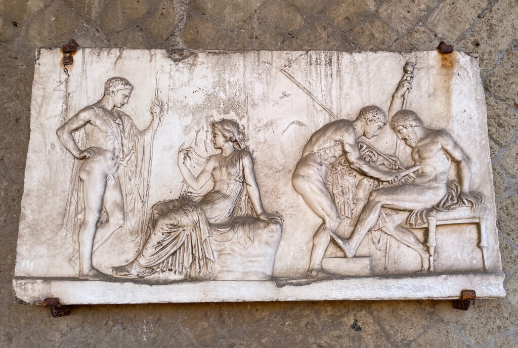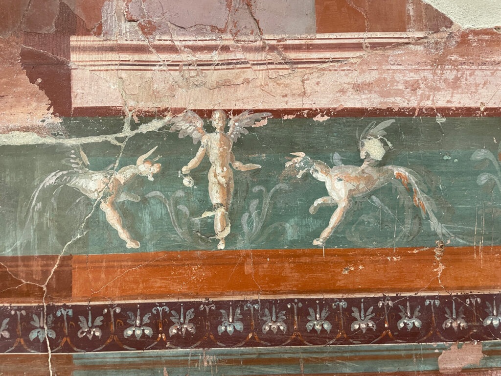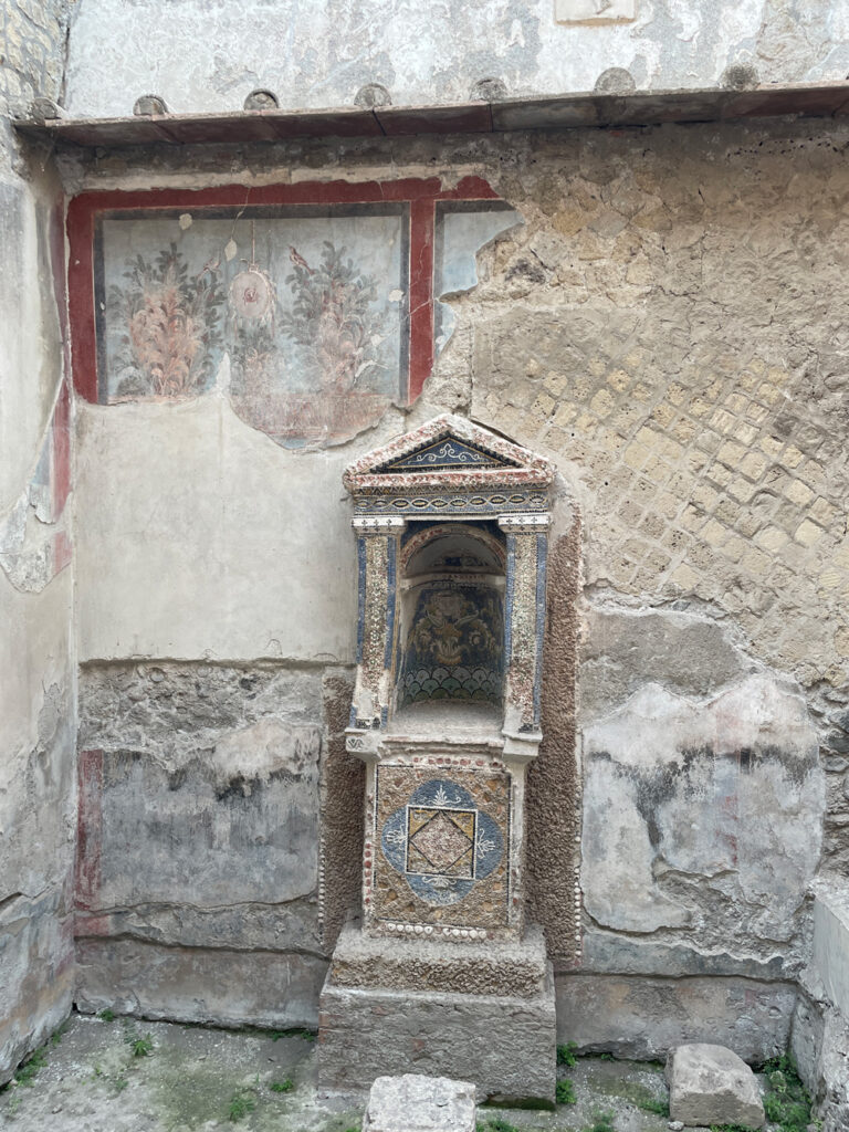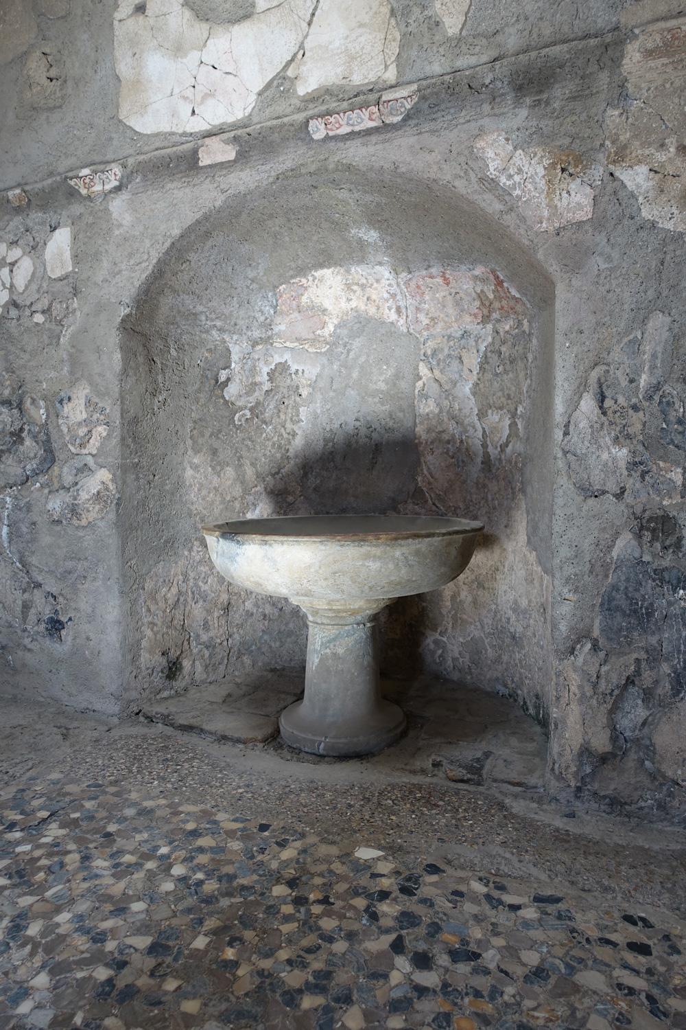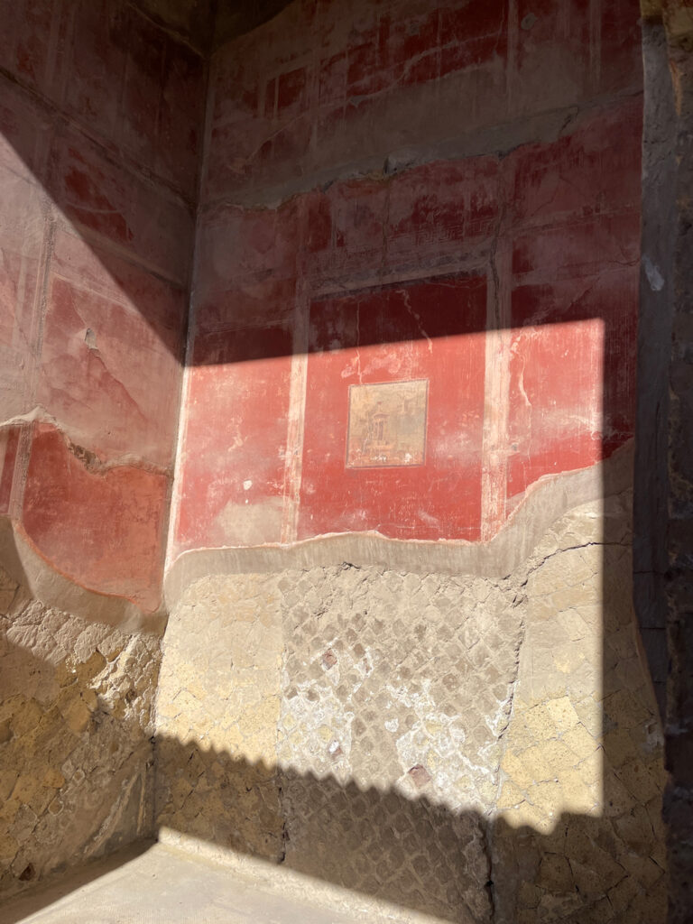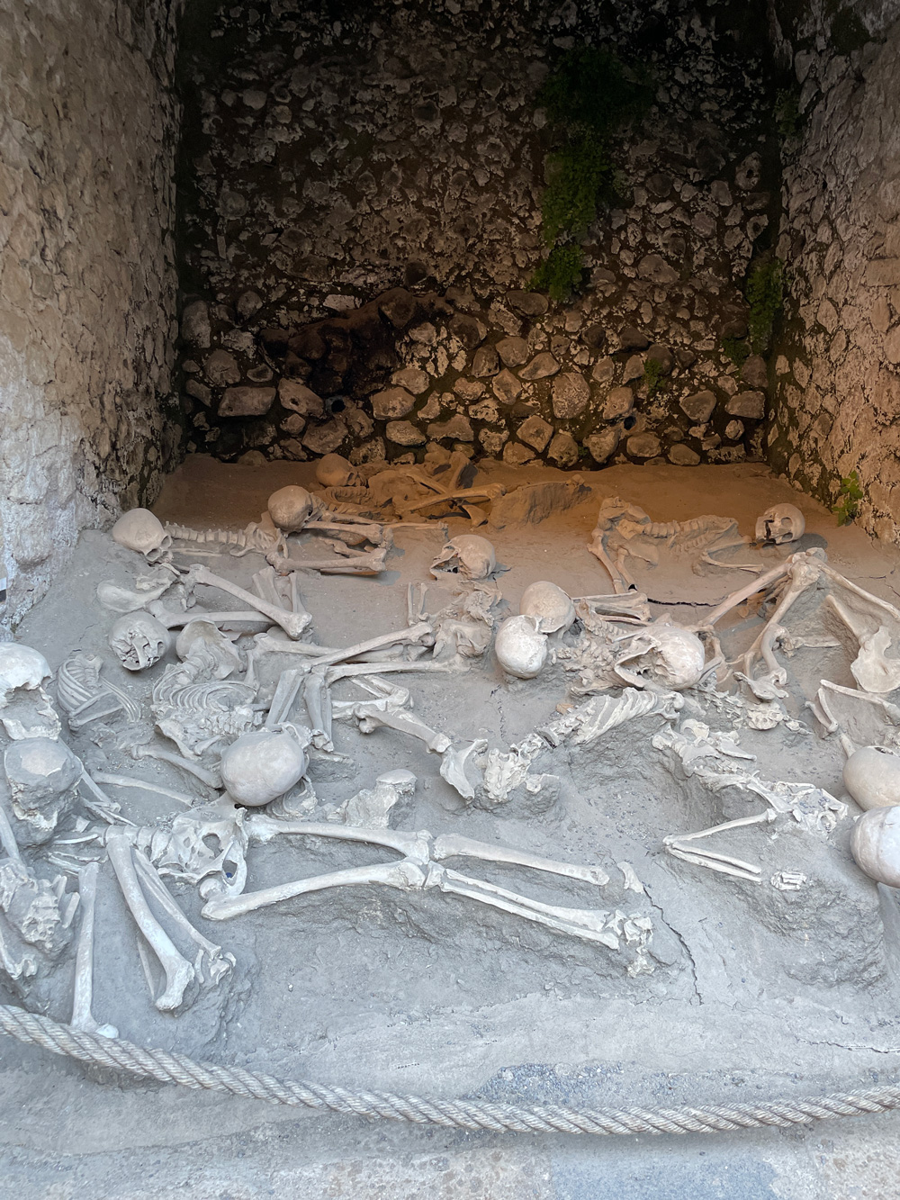 Herculaneum wurde zusammen mit Pompeji Opfer des Vesuvausbruchs 79 n.Chr. Es ist nur ein bißchen weiter entfernt und wurde deswegen „anders“ betroffen, was zur Bildung einer dicken Tuffsteinschicht führte, die Gebäude und Dinge besser konservierte. Wer’s genau wissen will, möge das Internet befragen! Der Besuch lohnt sich und man kann wirklich rumspinnen und sich vorstellen, wie die Menschen vor 2000 Jahren dort gelebt haben – und gestorben sind. Allein die Straßen mit ihrem Riesenpflaster und Gehwegen, Thermen, Straßenverkauf, Statuen und Schmuck, bemalte Wände und Mosaike am Boden …!