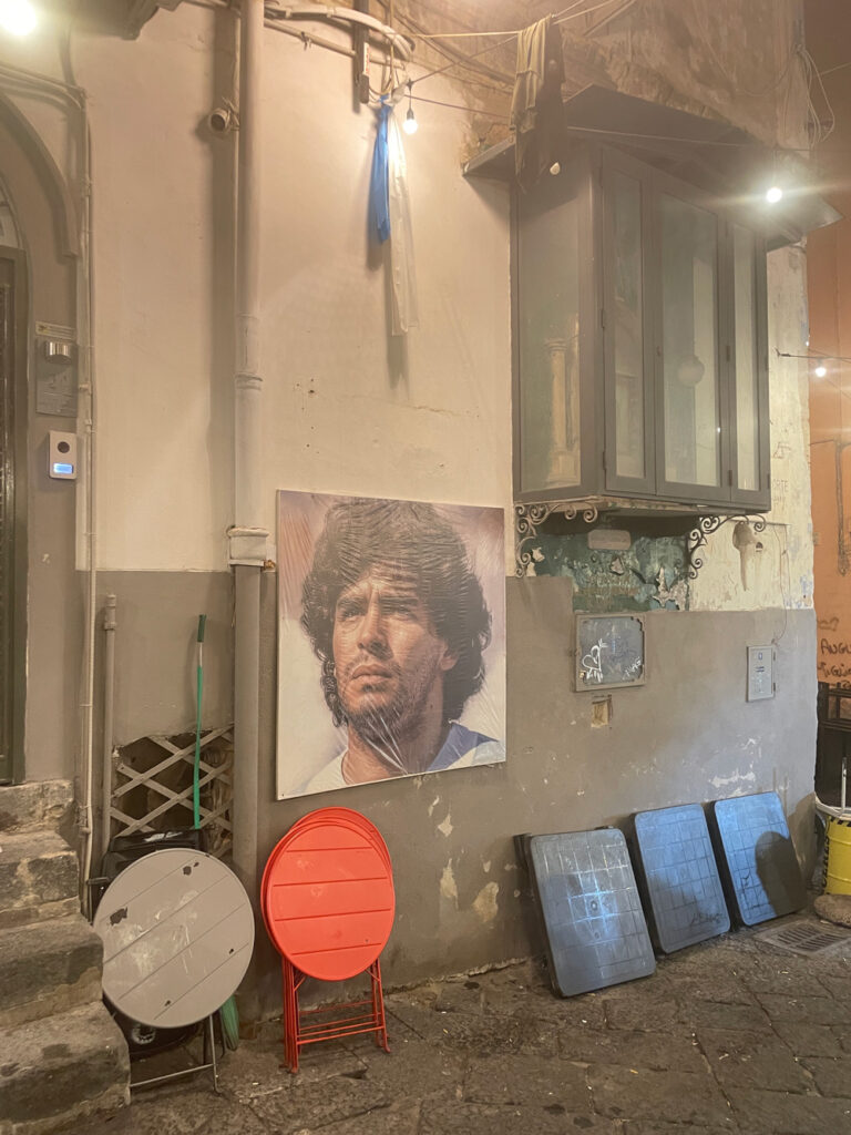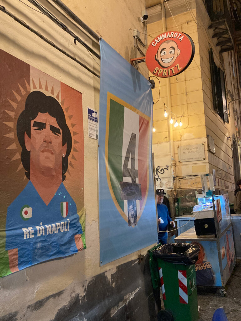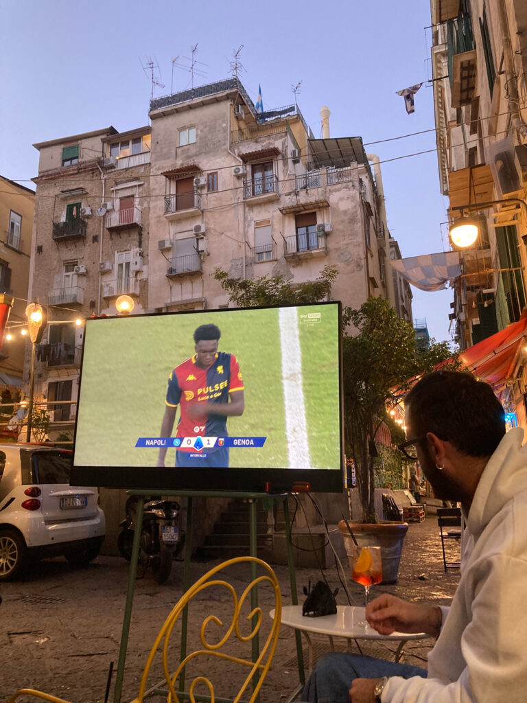 Neapel ist aber sowieso wie ein Film. Düster, lebhaft, überraschend, prächtig, runtergekommen, zugewandt, freundlich und komplett Maradonnaverrückt! Maradonna findet man an jeder zweiten Straßenecke: Bilder, Trikots, Schals, Vitrinen … Das Fußballspiel Napoli gegen Genua haben wir uns per Livestream in einer bzw. vor einer Bar angesehen. Erstaunlicherweise war gar nicht sooo eine Stimmung. Aber Spaß hat’s gemacht – dazu den obligatorischen Aperol Spritz.