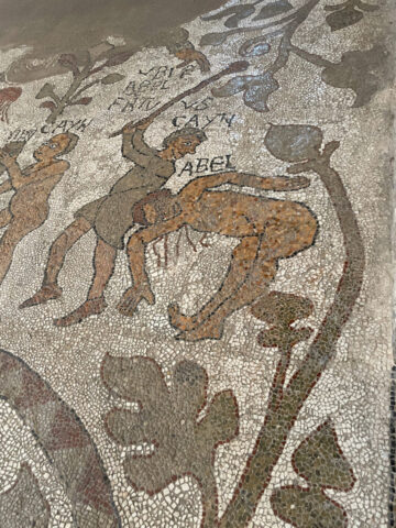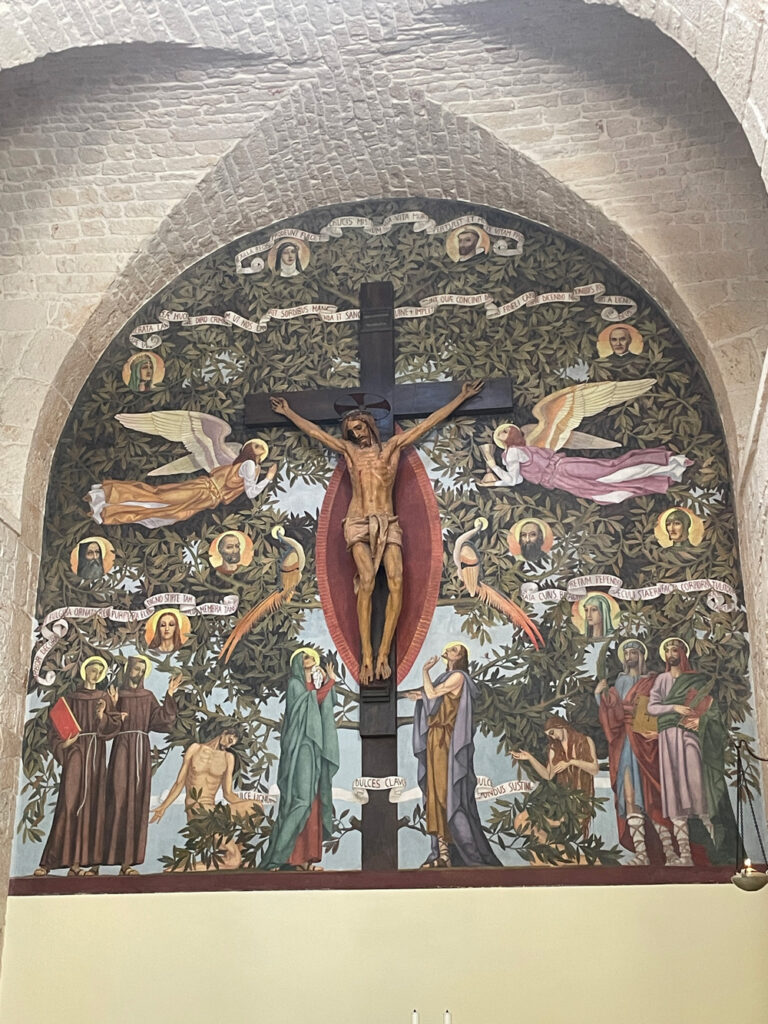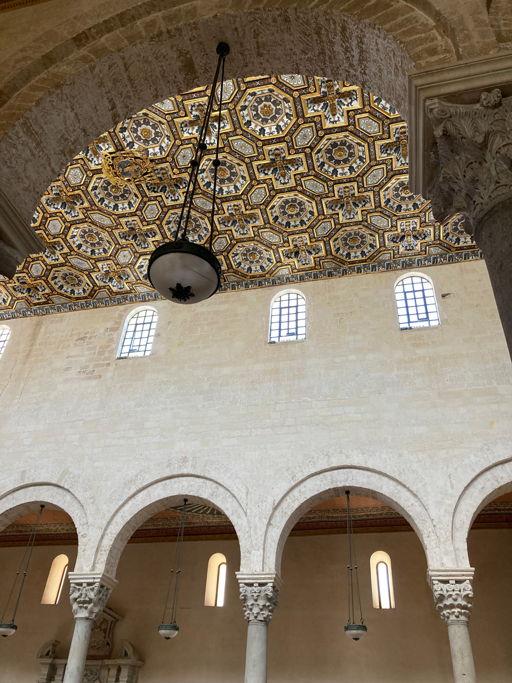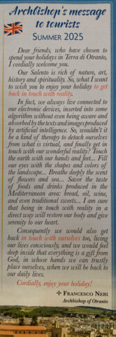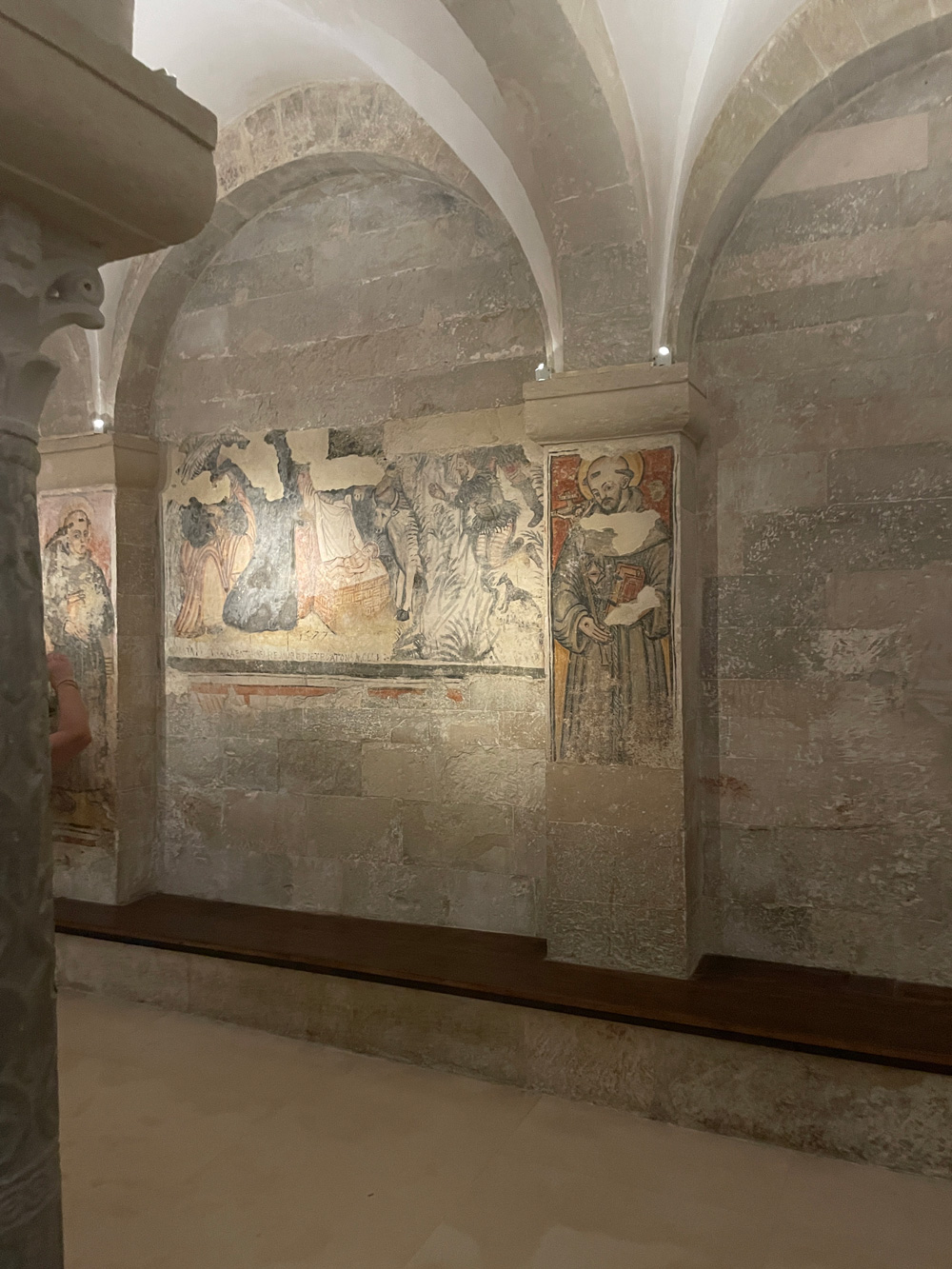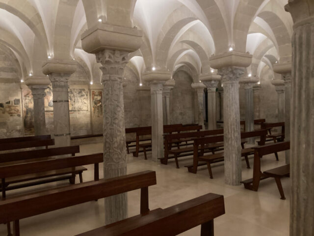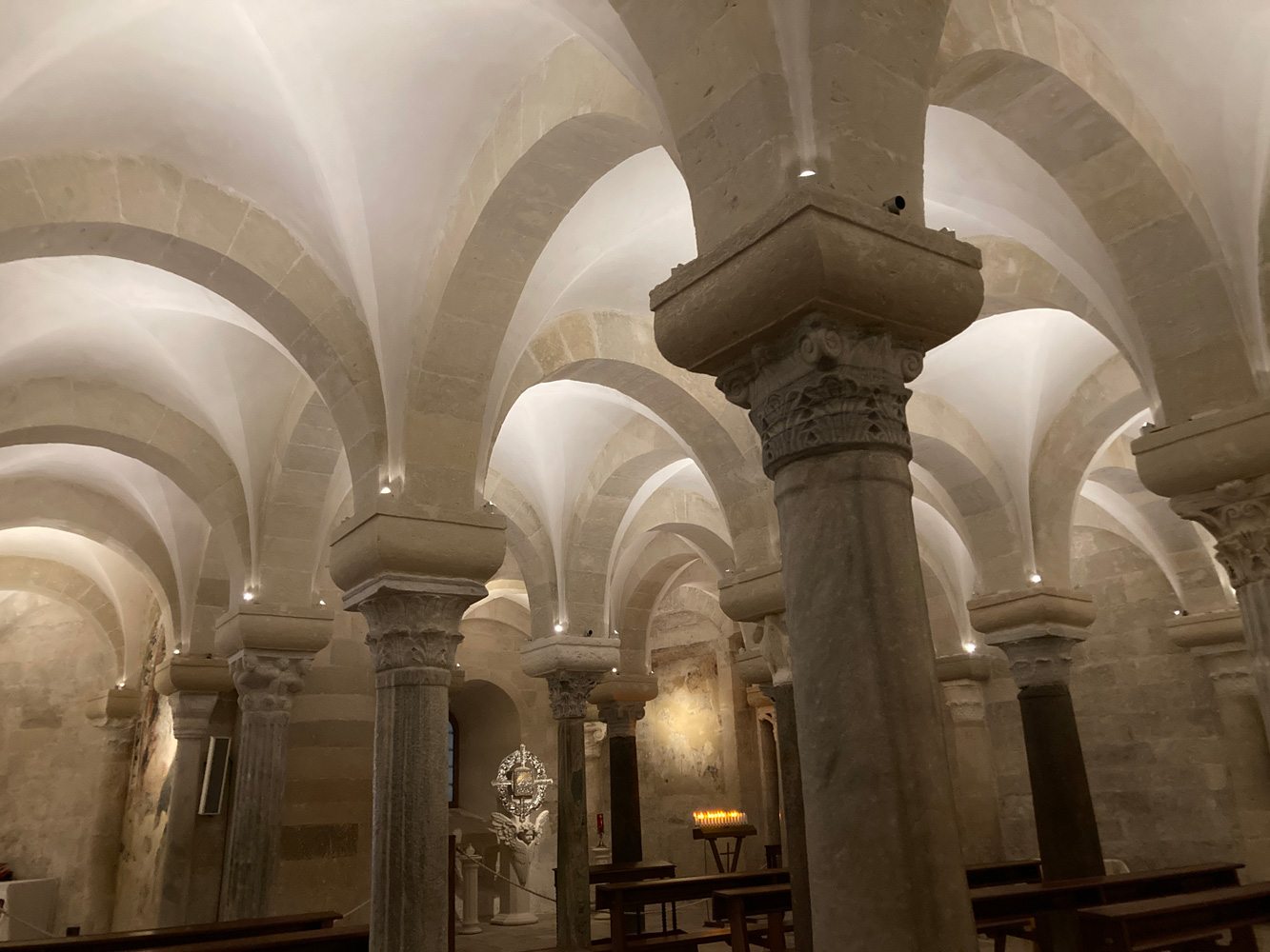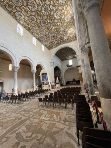 Also Otranto: Wir sehen uns die Basilica an mit ihrem riesigen Fußbodenmosaik, das die Geschichte der Menschheit darstellt. Und im Keller einen wunderschönen Andachtsraum mit Fresken, Säulen und einer besonderen Stimmung! Die Ansprache des Erzbischofs ist lesenswert!