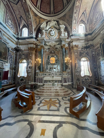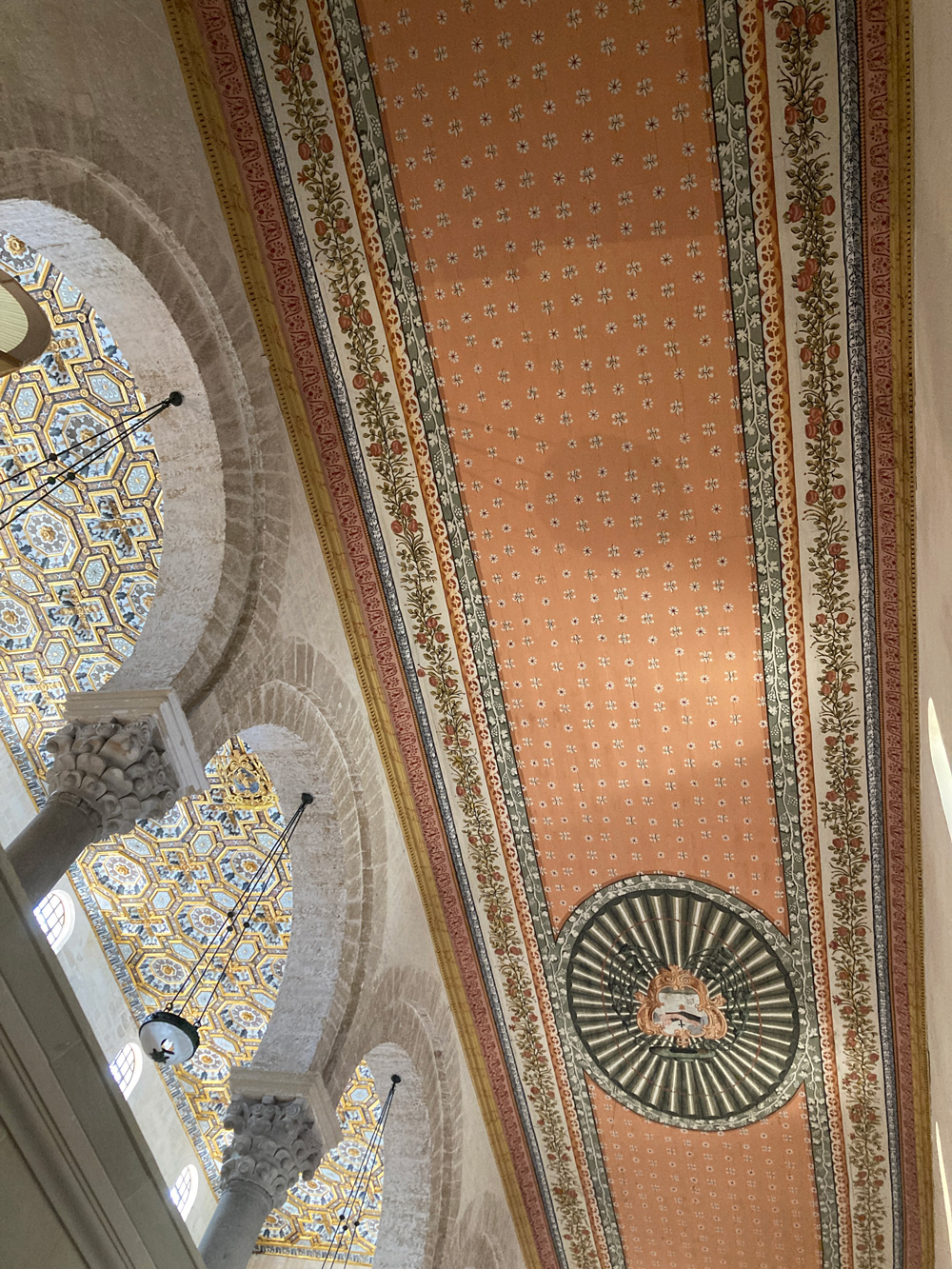 Auch in der Altstadt: die Basilika Santa Chiara. Ein ehemaliges Kloster mit einem wunderschönen Kreuzgang – komplett mit Fresken und bemalten Fliesen ausgestattet. Das Gebäude wurde im 2. Weltkrieg mehr oder weniger total zerstört aber in kürzester Zeit wiederaufgebaut. Von oben – also Panoramablick – sieht man erst, wie gigantisch diese Kirche ist – beeindruckend!